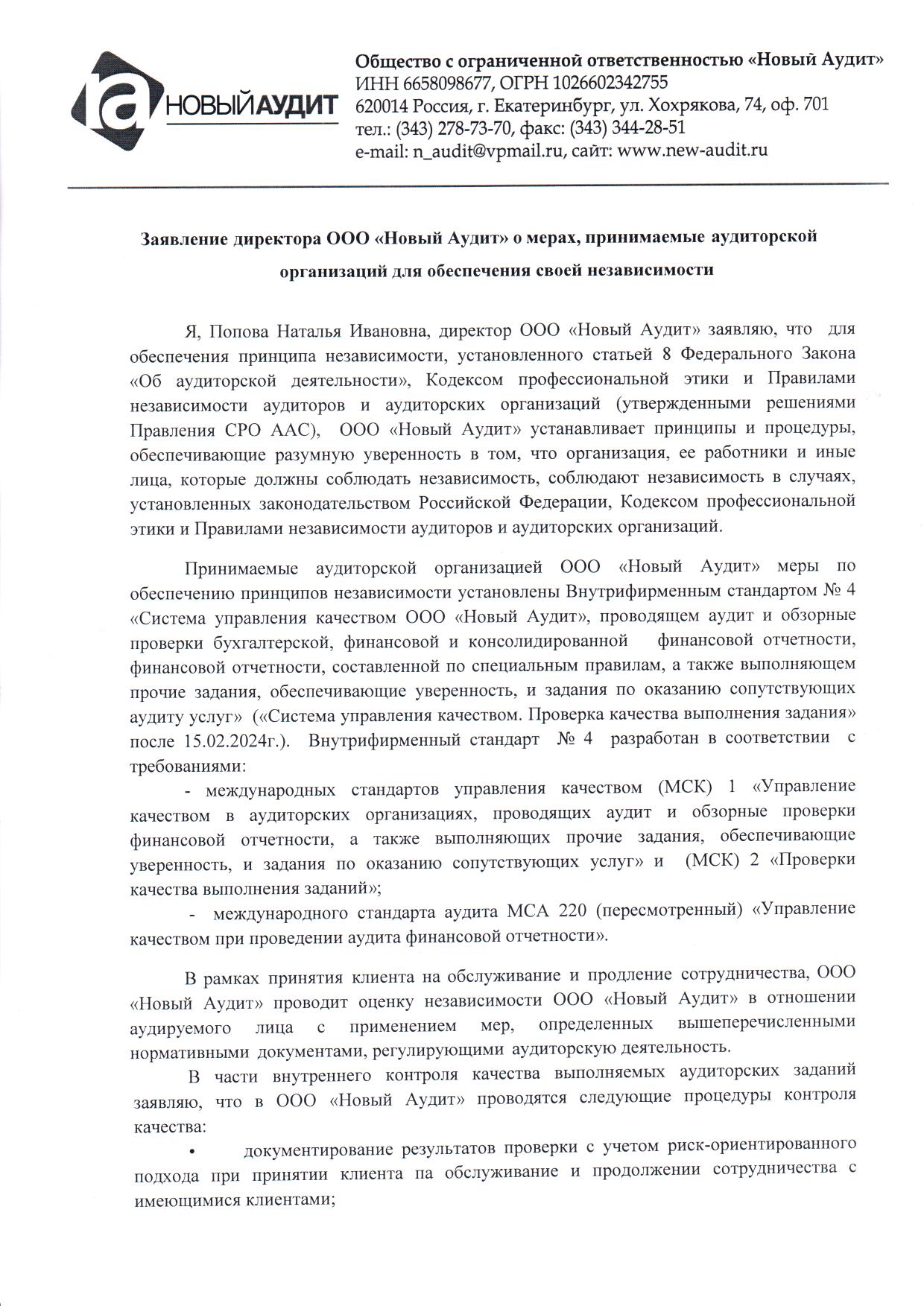 Заявление директора и принимаемых мерах обеспечения независимости