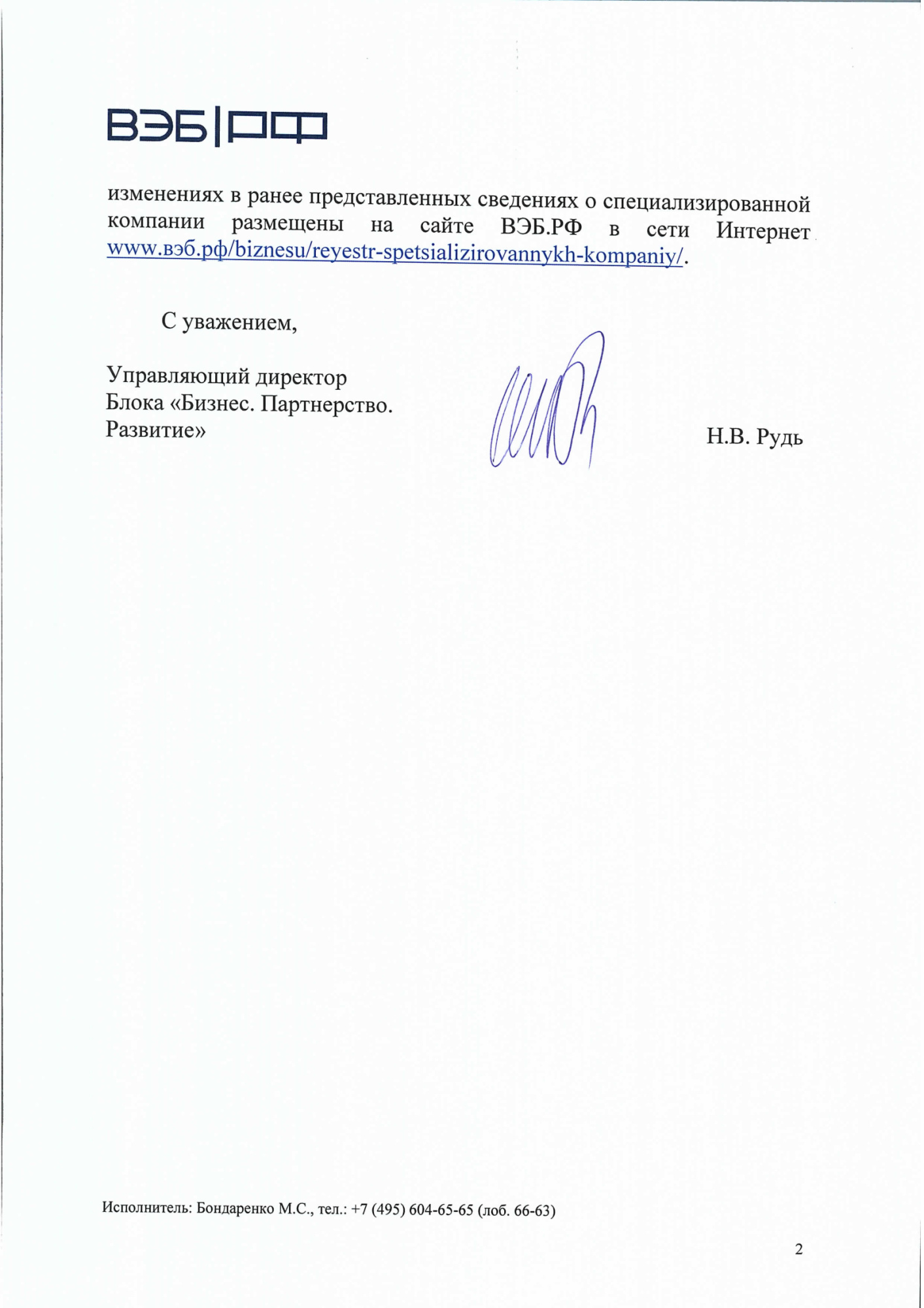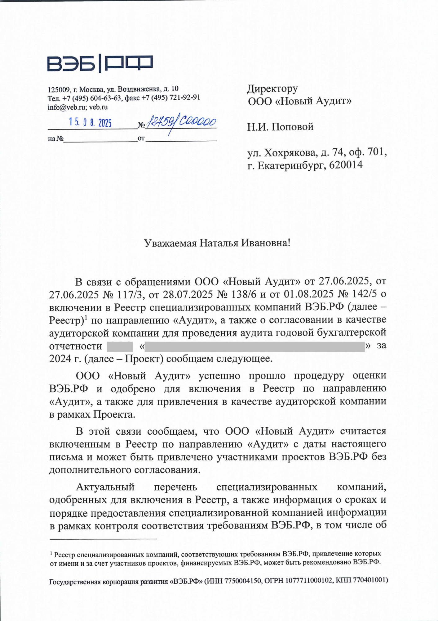 Уведомление ВЭБ.РФ о включении ООО "Новый Аудит" в реестр специализированных компаний по направлению "Аудит"